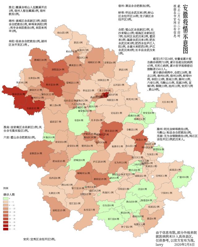 2020年2月8日0-24时,安徽省报告新增确诊病例46例,新增疑似病例48例,新增治愈出院病例12例,新增死亡病例1例。
