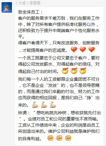 首先来说说员工关怀这方面,当然这两者并没有孰轻孰重之说,是同等重要的。我认为一个温度的企业,除了是整体的企业文化理念能让员工有共同的认同感,更重要的是对员工细节之处的关怀。特别是在他们的生活上,希望能让他们不用疲于基本的生存条件问题,工作从来也不会有后顾之忧。因此我们安徽大成决定疫情期间,工资照常发放、社保按时缴纳,为大家减轻资金方面的负担和压力。